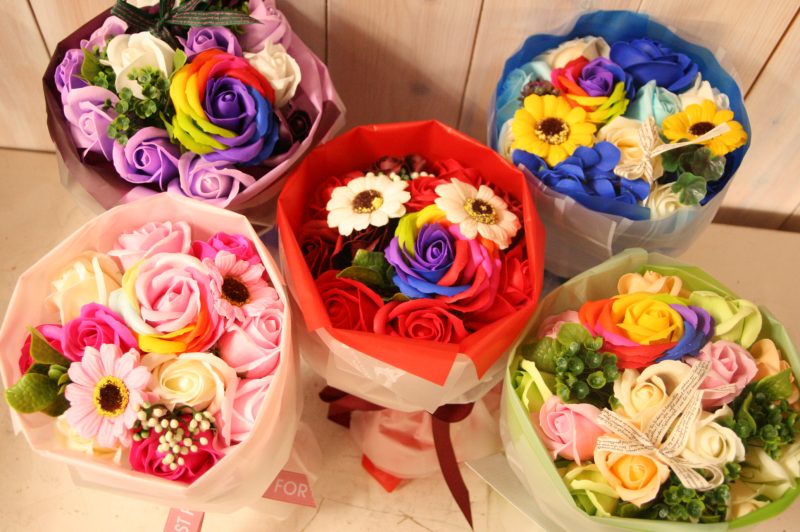 お知らせ 2019.06.11 ソープフラワー入荷しました! 99本ローズの花束 バルーンLED付 開店のお花にもおすすめです! ワンサイドの花束 結婚祝い、お誕生日、退職、記念日にご利用いただいております。 レインボー入りソープフラワーブーケ