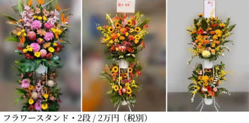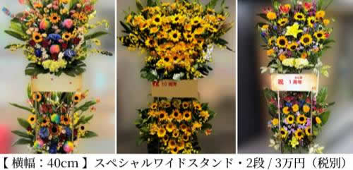 幅40cmの器に二段の豪華なアレンジメントがセットされたお祝い用フラワースタンドです。開店祝いのほか、周年のお祝い、お誕生日、コンサート、発表会などにも最適です。